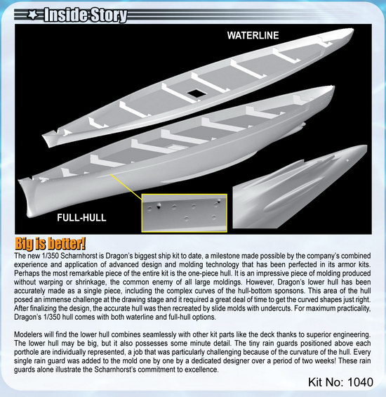 Dragon is proud to announce its most stunning ship kit ever – a 1/350 scale rendition of the famous German battleship Scharnhorst! The 31,500-ton Scharnhorst was commissioned on January 7 1939, and it often operated in partnership with its sister ship, Gneisenau. Buoyed by a top speed of 31.5 knots, this battleship wreaked havoc on Allied shipping with its nine 11-inch guns. It was involved in the invasion of Norway in 1940, during which it sank the British carrier HMS Glorious. In early 1941 the Scharnhorst and Gneisenau broke out into the Atlantic to lay siege to Allied shipping lanes. On December 25 1943, the Scharnhorst and accompanying destroyers put to sea to interdict Arctic convoys heading to Russia. However, aware of German plans, the British intercepted the Scharnhorst with a Royal Navy battleship, cruisers and destroyers. Reeling under multiple salvos of 2195 shells and 55 torpedoes, the Scharnhorst finally succumbed to its mortal wounds at 1945 hours on December 26. Of the 1968 crewmen aboard, only 36 survived. As an interesting footnote, the wreck of the Scharnhorst was discovered off North Cape in northern Norway in 2000.