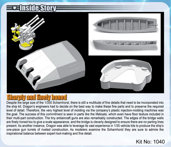 Dragon’s project to create a 1/350 scale kit of the Scharnhorst was a mammoth undertaking. The result of 18 months of intensive labor, the impressively sized kit is Dragon’s first ever battleship in this scale. And what a battleship it is! The enormous lower hull is made as a single piece via slide molds, and the accurate hull includes the correct undercut shapes. The deck fits perfectly onto the one-piece hull, with a single joint line completely hidden beneath the superstructure. The deck includes fine lines representing the plank pattern, and the bridge superstructure is made to the finest possible thickness. The bridge is also made by slide molds so that there are no parting lines to mar this highly visible element. The kit makes use of multimedia materials with a judicious use of photo-etched parts. The canvas waterproof covers that fit over the guns in their turrets are made from DS in order to give the necessary flexibility and realistic texture. The gun turrets, made by slide molds, are fully detailed, with even their riveted construction depicted.