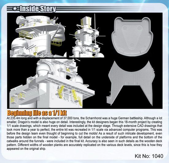 Dragon is proud to announce its most stunning ship kit ever – a 1/350 scale rendition of the famous German battleship Scharnhorst! The 31,500-ton Scharnhorst was commissioned on January 7 1939, and it often operated in partnership with its sister ship, Gneisenau. Buoyed by a top speed of 31.5 knots, this battleship wreaked havoc on Allied shipping with its nine 11-inch guns. It was involved in the invasion of Norway in 1940, during which it sank the British carrier HMS Glorious. In early 1941 the Scharnhorst and Gneisenau broke out into the Atlantic to lay siege to Allied shipping lanes. On December 25 1943, the Scharnhorst and accompanying destroyers put to sea to interdict Arctic convoys heading to Russia. However, aware of German plans, the British intercepted the Scharnhorst with a Royal Navy battleship, cruisers and destroyers. Reeling under multiple salvos of 2195 shells and 55 torpedoes, the Scharnhorst finally succumbed to its mortal wounds at 1945 hours on December 26. Of the 1968 crewmen aboard, only 36 survived. As an interesting footnote, the wreck of the Scharnhorst was discovered off North Cape in northern Norway in 2000.