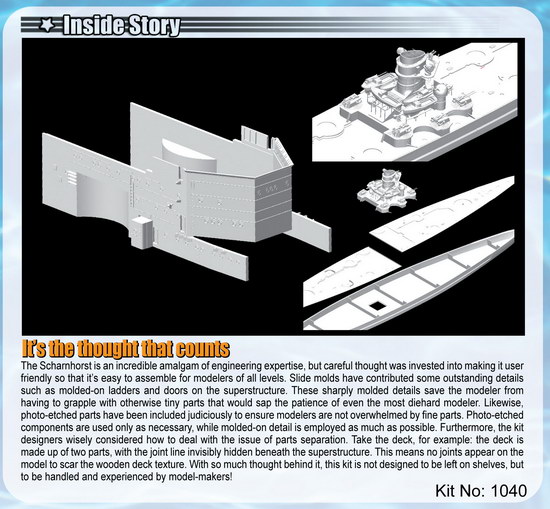 This kit represents the Scharnhorst as it appeared on its final mission in 1943. Ship modelers are certain to be tantalized by the Scharnhorst’s mouthwatering level of detail and sophistication!