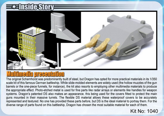 Dragon’s project to create a 1/350 scale kit of the Scharnhorst was a mammoth undertaking. The result of 18 months of intensive labor, the impressively sized kit is Dragon’s first ever battleship in this scale. And what a battleship it is! The enormous lower hull is made as a single piece via slide molds, and the accurate hull includes the correct undercut shapes. The deck fits perfectly onto the one-piece hull, with a single joint line completely hidden beneath the superstructure. The deck includes fine lines representing the plank pattern, and the bridge superstructure is made to the finest possible thickness. The bridge is also made by slide molds so that there are no parting lines to mar this highly visible element. The kit makes use of multimedia materials with a judicious use of photo-etched parts. The canvas waterproof covers that fit over the guns in their turrets are made from DS in order to give the necessary flexibility and realistic texture. The gun turrets, made by slide molds, are fully detailed, with even their riveted construction depicted.